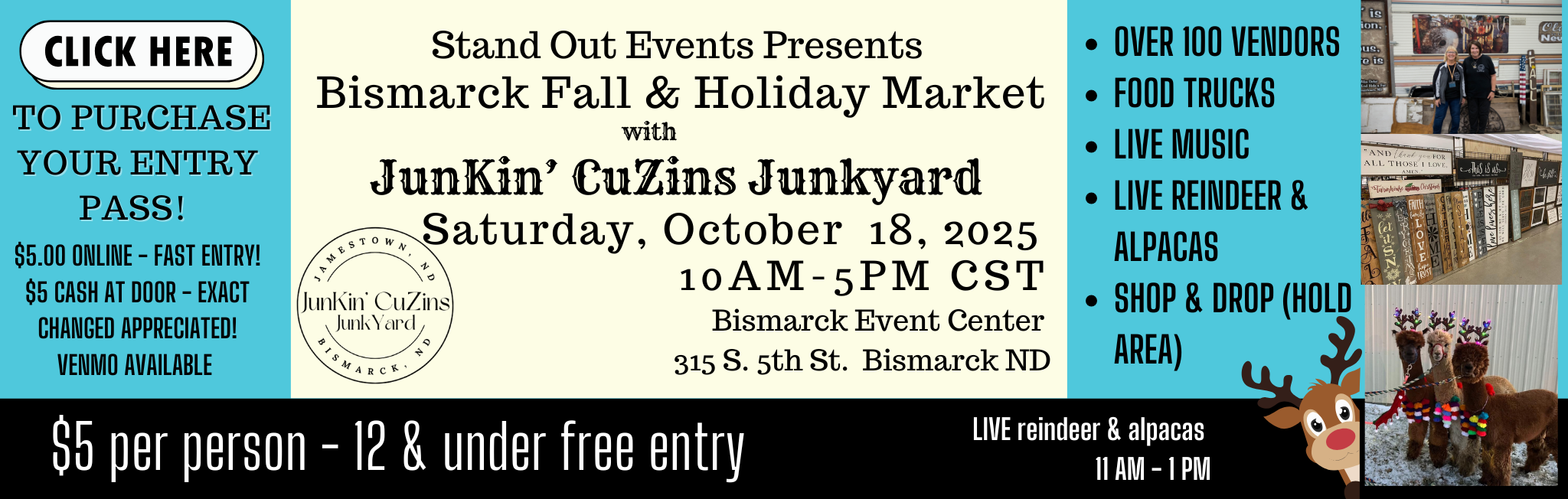 JOIN US FOR OUR NEXT EVENT! Our 8th Annual Bismarck Fall & Holiday Market with JunKin’ CuZins! Click below for tickets or pay cash at the door! Click here for more information about the event!